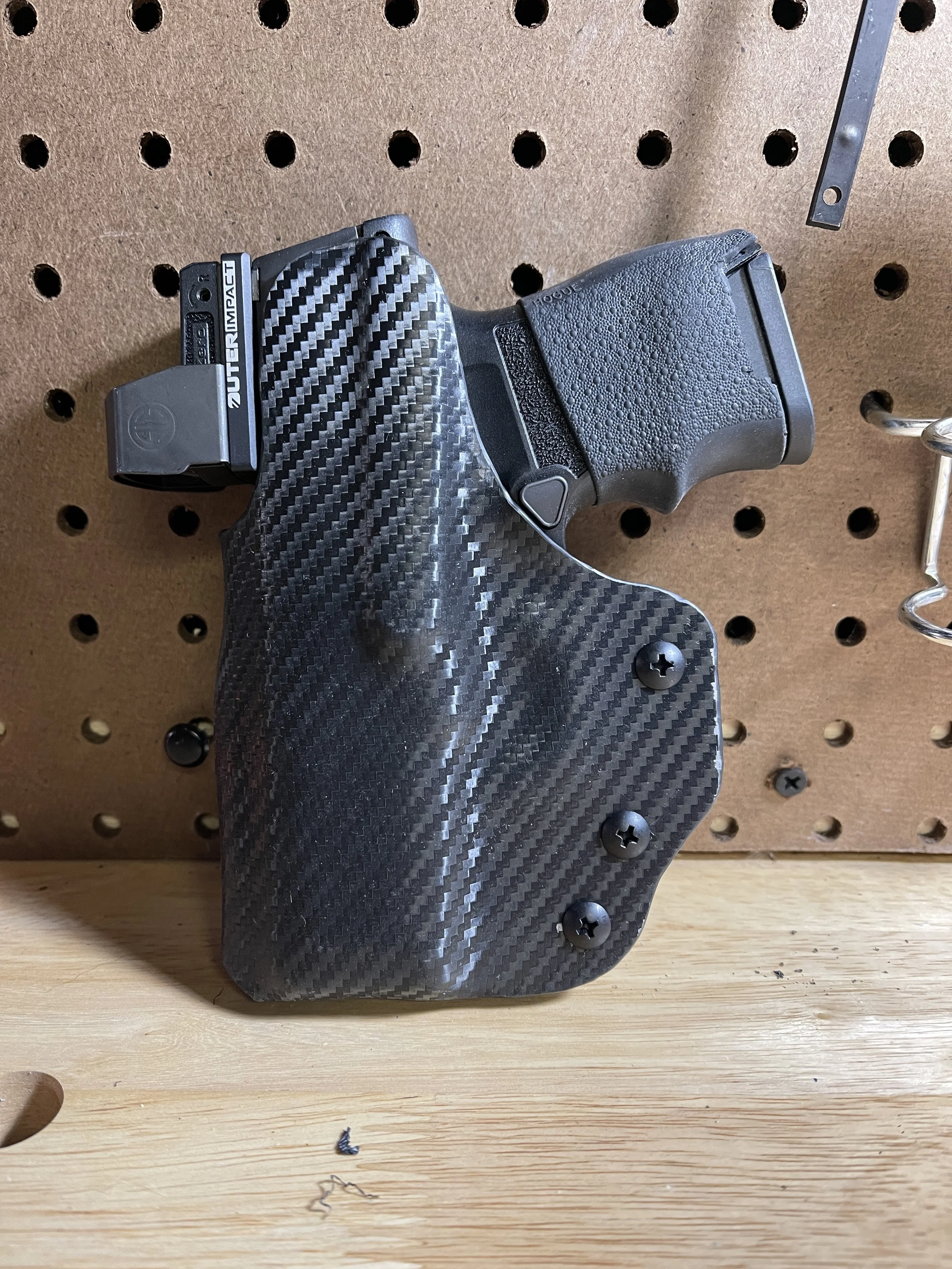 Our inside the waistband concealment holsters are made using .080 Holstex or Kydex material. Holsters are made using FOMI for either a 1.5” or 1.75” belt and be made with straight vertical orientation or with a 10° forward or rearward cant. We can accommodate most popular pistol models without needing your pistols in shop. If a light or optic cut is requested the light and or pistol may be requested to use as a mold. Typical turn around time for a holster is 7 to 10 days. Time may be a little less if the mold is on hand or the customer pistol is being used is left when the holster is ordered. Many parts are ordered on demand so delays in shipping times can impact completion time.